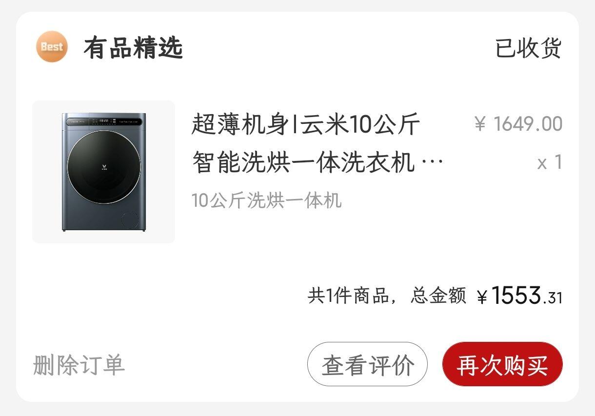 其实也没买太多东西,目前就买了一些大家电,买了一台云米智能洗衣机,一张林氏家居的床,还买了米家冰箱,以及一台红米75英寸电视,还有一张沙发,大部分是在小米有品买的,有的东西还没发货。我也算是没见过世面,以前也没用过带烘干洗衣机,这次趁着活动,价格也划算,就入手了,师傅安装完成之后,第二天我就试了烘干功能,确实好用,衣服出来就可以直接穿了,不过坏处应该有点费电了。